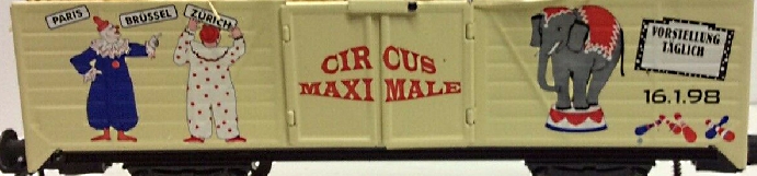Der Circuszug von MAXI ist zusammengestellt aus sogenannte Museumswagen. Jedes Jahr von 1996 bis 2006 produzierte Mä einer Typus. Und im Jahr 2002 gab es eine Museumslok mit Circus-design im Mä-Programm. Dieser Lok, am Anfang verschmäht von die MAXI-Liebhaber, ist heute sehr beliebt. Es soll auch noch einer Circuswagen für 2007 entworfen sein, der als Muster produziert wurde und in extrem kleiner Anzahl auf dem Markt gelangen ist.