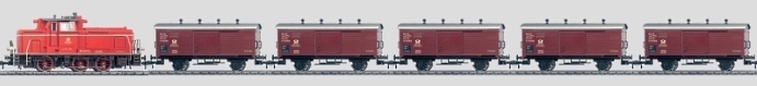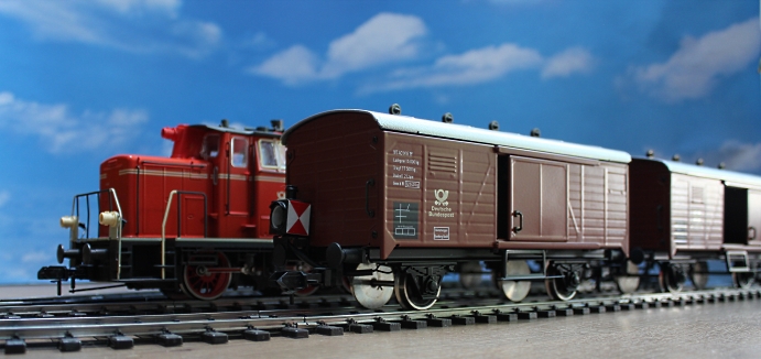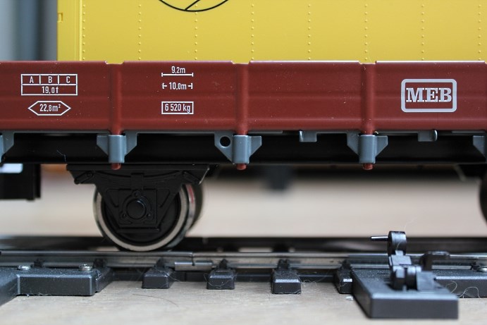 Die mitgelieferten Wagen sind nicht sehr detailliert und wirken daher etwas grob im Vergleich mit der detaillierte Lok. Daß der Niederbordwagen mit "MEB" gekenzeichnet ist, ist einfach Fehlerhaftes Entwurf: es sollte einem Postlogo darauf gestanden haben.