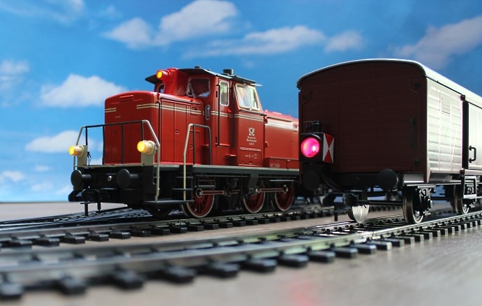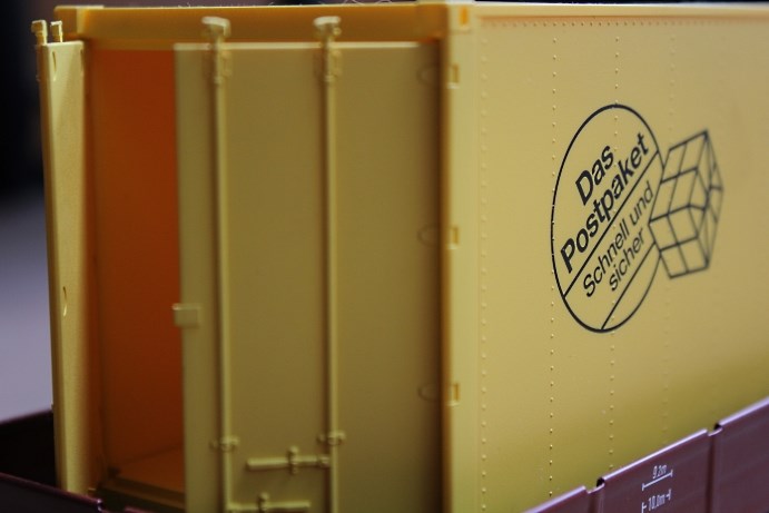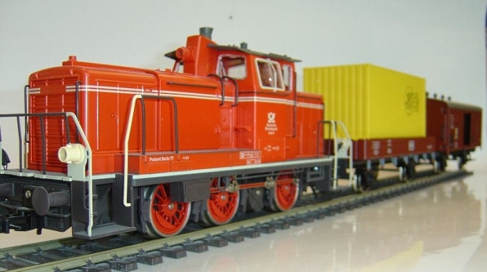 Obwohl mit dem Logo der Deutschen Post beschriftet, kann man diese Lok doch auch als Rangierhilfe auf die MAXI-Bahn einsetzen. Die Telex-Entkuppler erregt dabei viel Spaß.