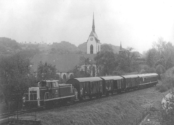 Einsatz der 261 841 in 1984 (Ozeanblau - Beige) auf der Wehratalbahn bei Öflingen. Aufgenommen von der Schmadstraße, Richtung Kath. St. Ulrichskirche:
