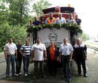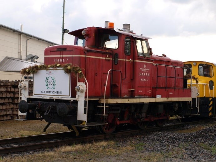 07.07.2009 Mit einem imposanten grünen Blätterkranz und einem Jubilarsschild feierten Mitarbeiter des Hafen- und Güterverkehr der Stadtwerke Osnabrück gemeinsam mit Kollegen von der Verkehrsgesellschaft Landkreis Osnabrück (VLO) die 50 Jahre alte LOK "Haba 7".