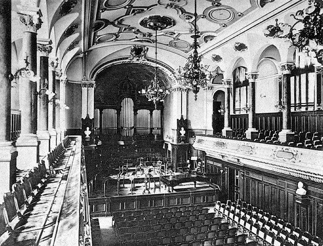 The organ at the large auditorium of the Leipzig Conservatory was built by the organ builder Walcker in 1887 (cf. a paper on the organs of Leipzig by Karl Tittel in Acta Organologica 26 (1998), page 130, note 76). The rich organ-tradition of this Leipzig institute is not at least reflected in the fact that at the time it possessed 6 (six!) organs in total, three of which had 3 manuals!!!